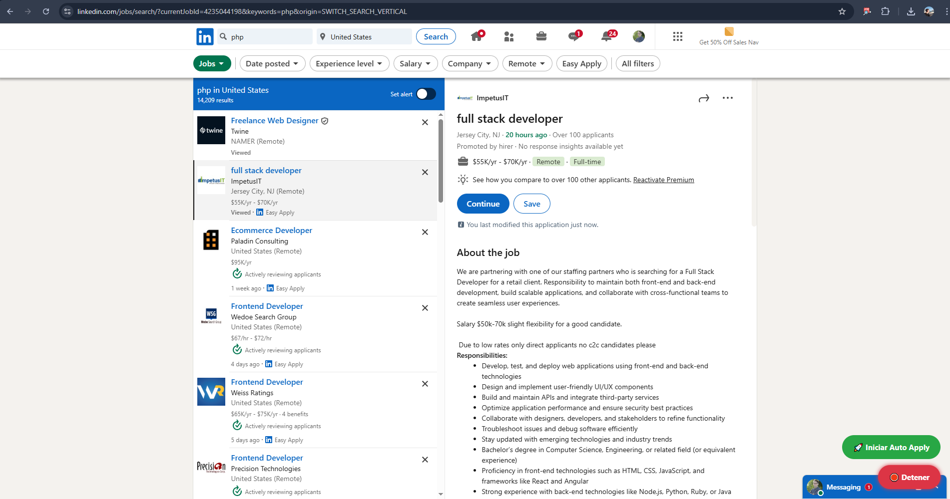 Extensión desarrollada en JavaScript para Google Chrome, pensada como experimento técnico para automatizar el proceso de postulación en LinkedIn, específicamente para aquellas ofertas que permiten la opción de “Solicitud sencilla” (Easy Apply).